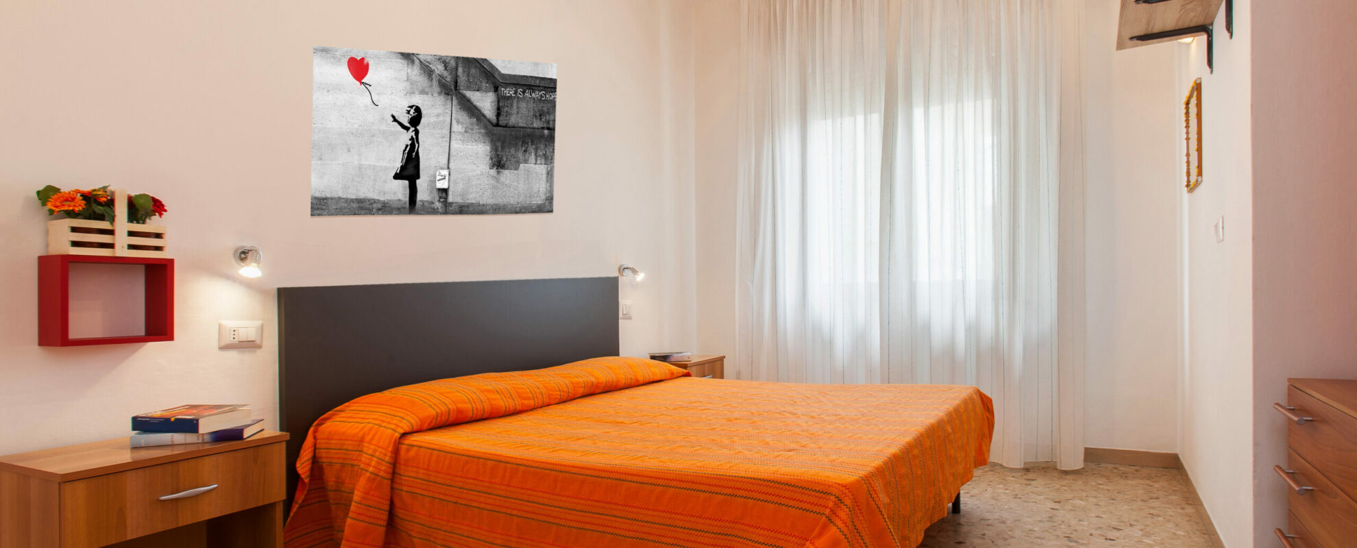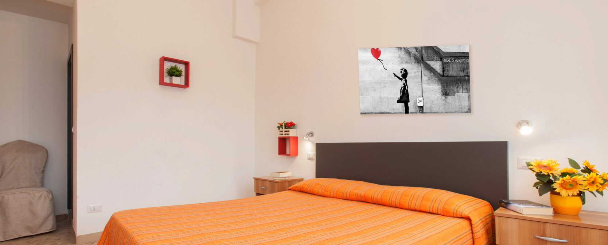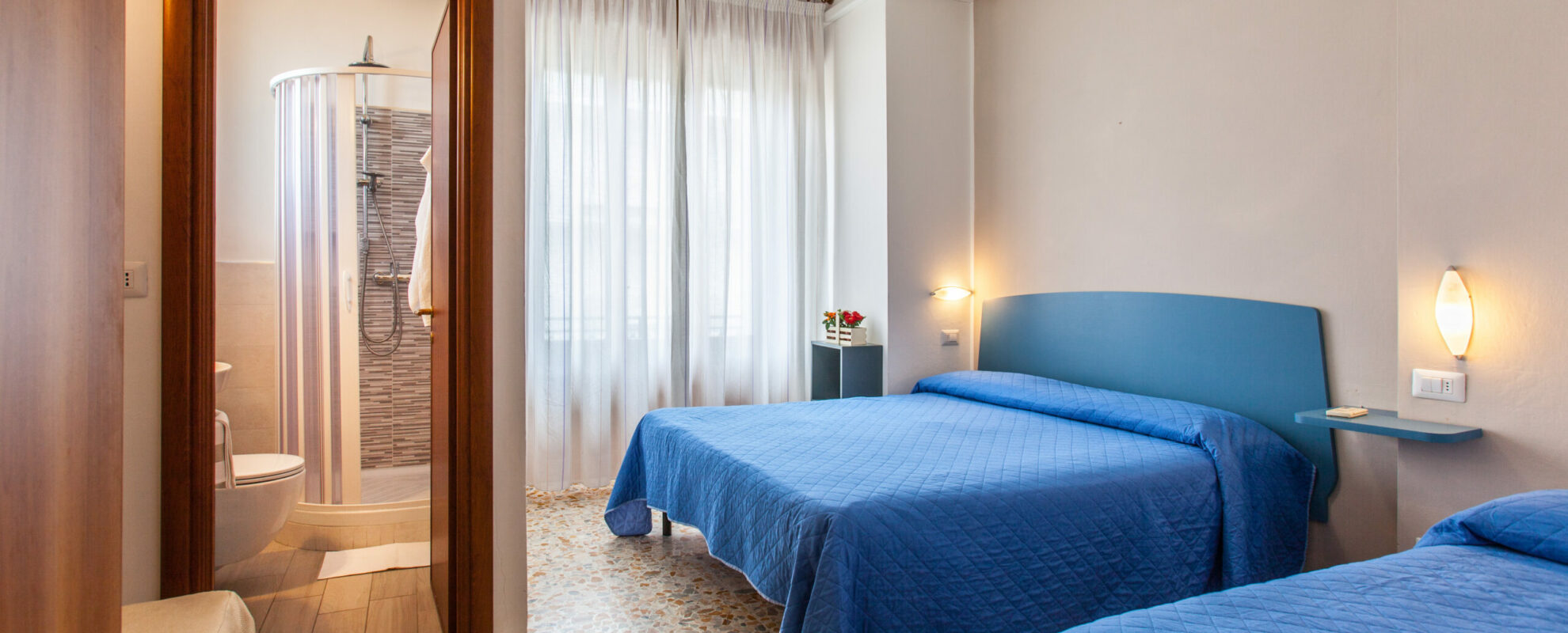 Le 4 camere, ciascuna dotata di aria condizionata autonoma e bagno con box doccia di nuova ristrutturazione, offrono un arredamento semplice, accogliente e confortevole.