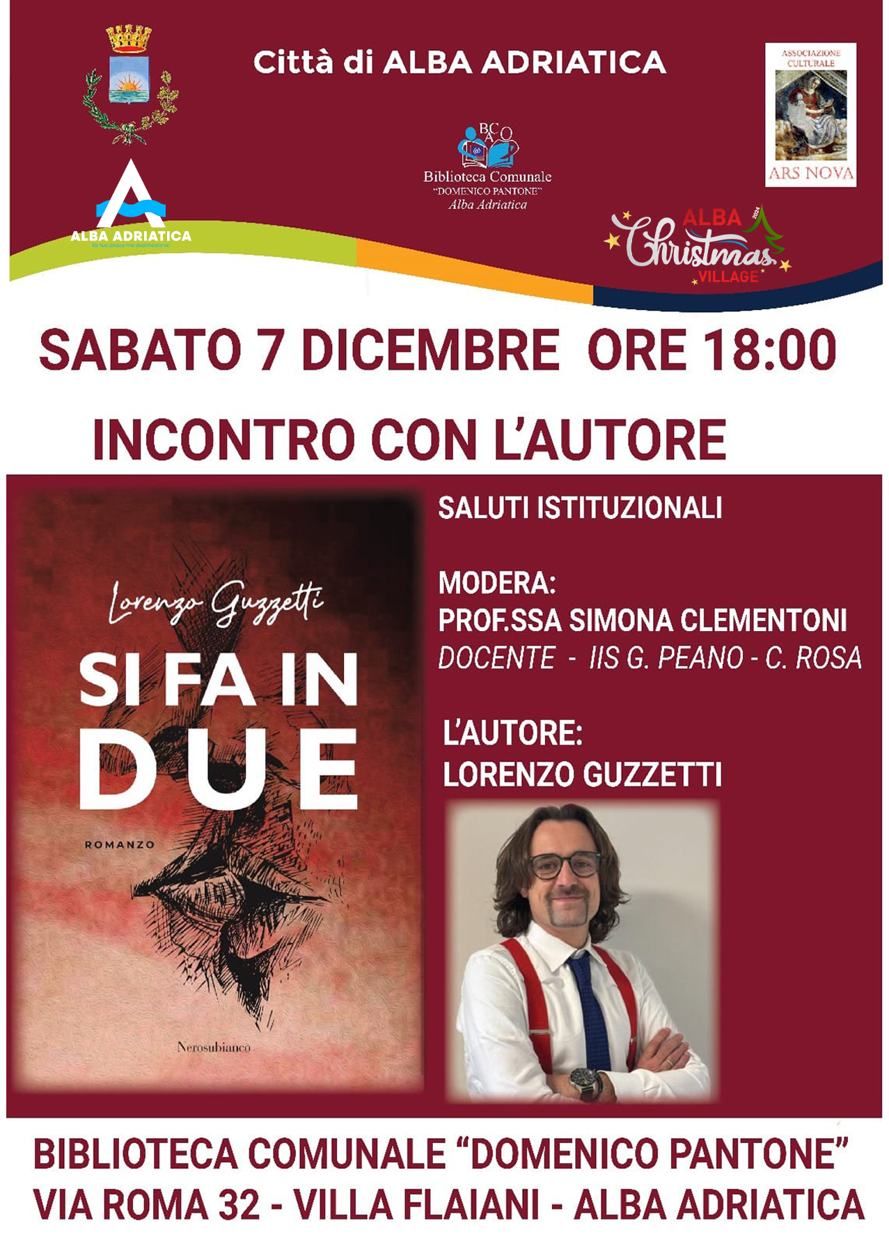 Incontro con l'autore, in Villa Flajani Sabato 7 dicembre alle ore 18:00, la Biblioteca Comunale “Domenico Pantone” di Alba Adriatica ospita un evento speciale: la presentazione del romanzo “Si fa in due” di Lorenzo Guzzetti. 🎤 Modera: Prof.ssa Simona Clementoni, docente presso IIS G. Peano - C. Rosa. 📖 L’autore Lorenzo Guzzetti ci […]