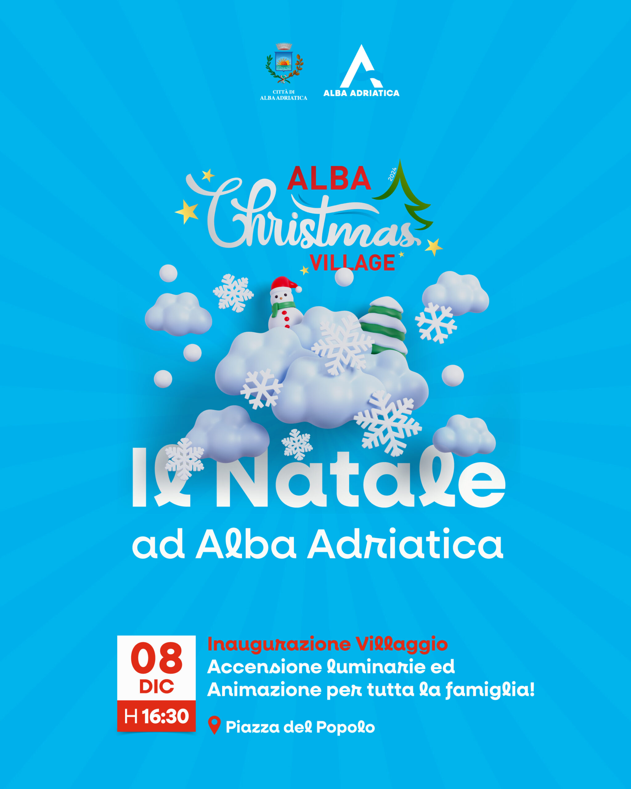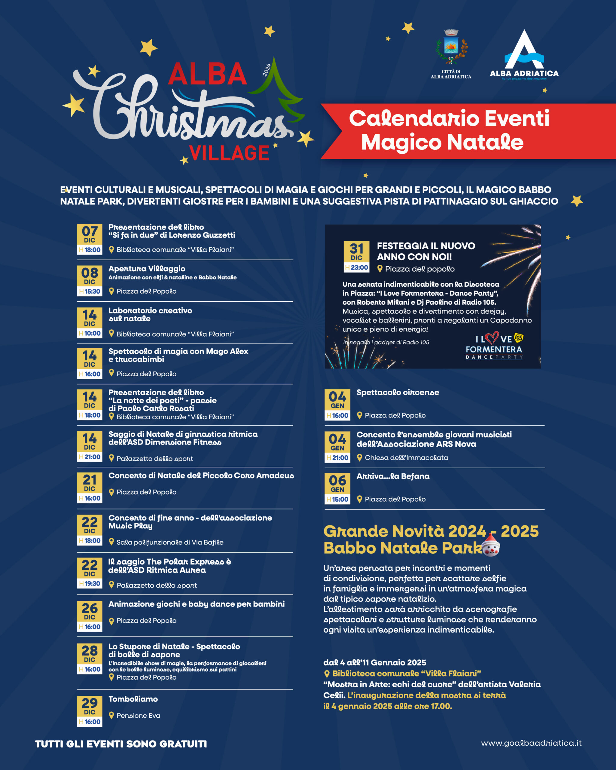 ALBA CHRISTMAS VILLAGE 2024 Inauguriamo il Villaggio "Magico Natale" Pista sul ghiaccio, Luna Park, il Babbo Natale Park, un ambiente fantastico con le sue scenografie e strutture luminose dove poter stare in compagnia di amici e scattare foto. Domenica 8 Dicembre 2024: ore 15.30 - Piazza del Popolo: Accensione luminaria del villaggio con l’animazione di […]