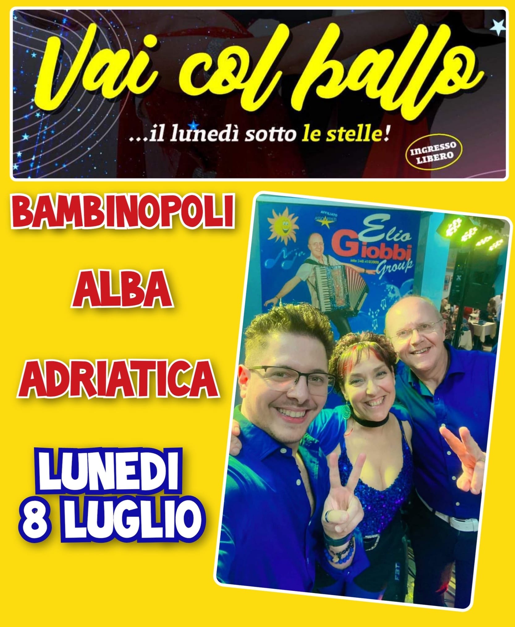 Torna "VAI COL BALLO", con Elio Giobbi Group. Anche quest'anno appuntamento fisso con ballo tutti i lunedì presso la Bambinopoli Comunale, una serie di serate danzanti ad Ingresso Libero organizzate dal Comune di Alba Adriatica con la collaborazione di ASD Music&Dance Academy e l'Associazione Arte Viva, patrocinate dall'AssoArtisti dell'Adriatico.